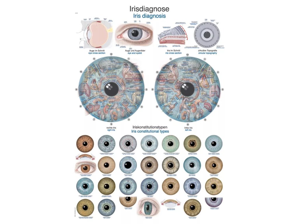 Anatomický plagát „Diagnostika dúhovky“ – AL526 od Erler Zimmer obsahuje komplexnú mapu irisu pre iridológiu, ktorá znázorňuje projekcie orgánov a telesných zón v dúhovke. Kľúčová diagnostická pomôcka pre prírodnú medicínu.