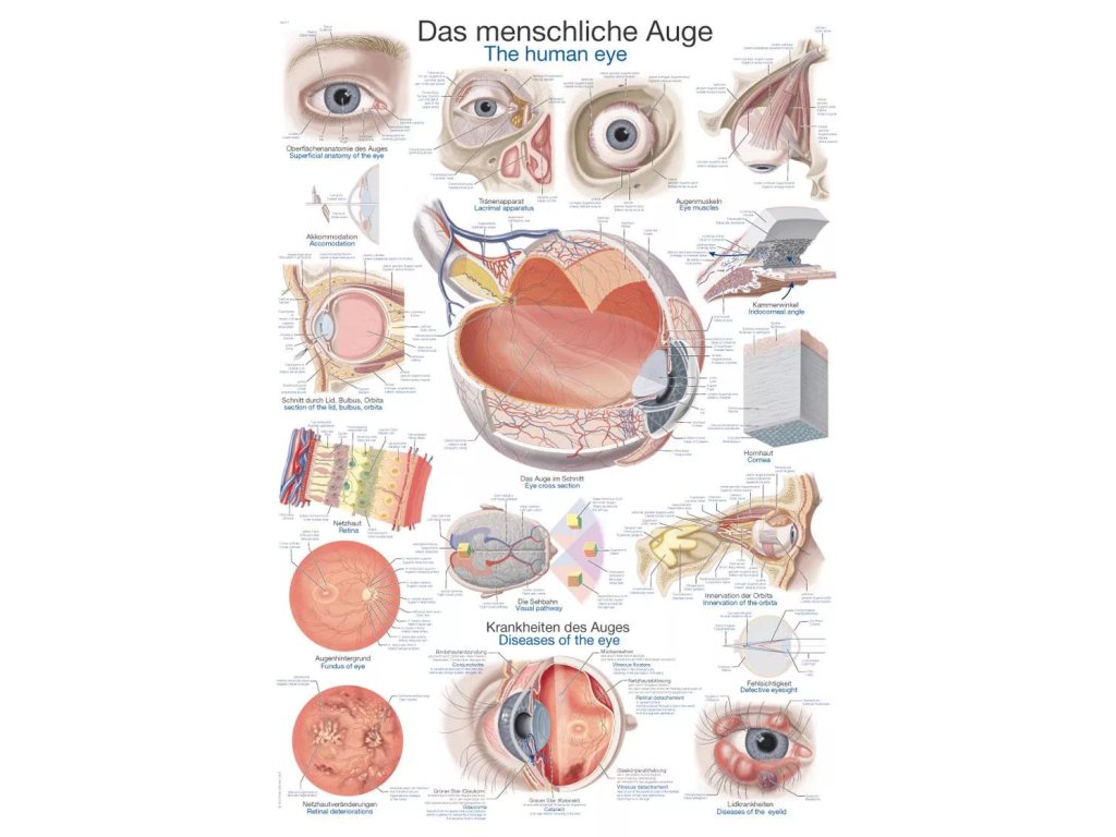 Anatomický plagát „Ľudské oko“ – AL511 od Erler Zimmer je kvalitná didaktická pomôcka určená na vizuálne znázornenie anatómie oka. Tabuľa s rozmermi 50 × 70 cm obsahuje presné farebné ilustrácie s popismi jednotlivých častí, ako sú rohovka, dúhovka, šošovka, sietnica, sklovec, zrakový nerv a cievne štruktúry oka.