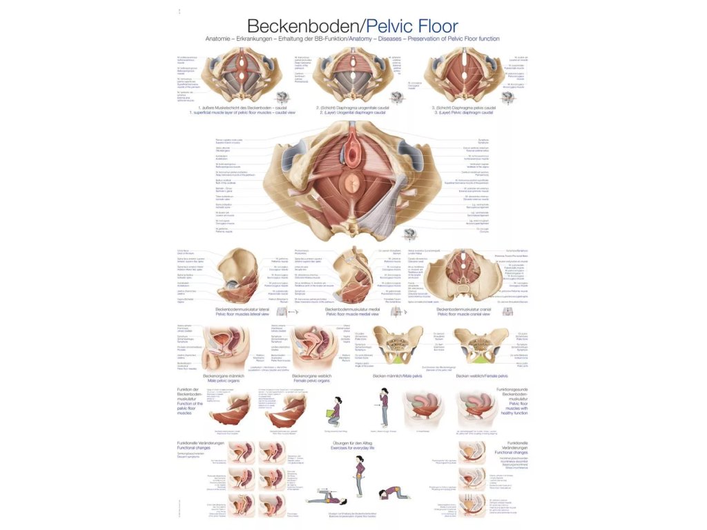 Anatomický plagát „Panvové dno“ – AL538 od Erler Zimmer je špecializovaná vzdelávacia pomôcka zameraná na detailnú anatómia a funkciu panvového dna. Plagát je vyrobený z vysokokvalitného 200g/m² umeleckého papiera a dodáva sa s pripojiteľnými plastovými lištami pre ľahké zavesenie. Grafika prehľadne znázorňuje rôzne vrstvy a svalové skupiny panvového dna (Diaphragma pelvis a urogenitale), ich úpony a vzťah k orgánom v malej panve. Plagát je neoceniteľný pre pochopenie problémov ako inkontinencia a oslabenie panvového dna a je nevyhnutnou pomôckou pre cvičenia zamerané na jeho posilnenie. Nomenklatúra je uvedená v nemeckom a anglickom jazyku. Tento anatomický plagát je kľúčovým zdrojom pre fyzioterapeutov, pôrodné asistentky, gynekológov a špecialistov na rehabilitáciu. Je ideálny do kliník, rehabilitačných centier a poradní na účely edukácie pacientov a výučby špecializovanej anatómie.