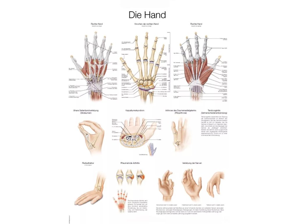 Anatomický plagát „Ruka“ – AL529 od Erler Zimmer detailne mapuje anatómia kostí, kĺbov, svalov, šliach, nervov a ciev ruky a zápästia. Základná učebná pomôcka pre ortopédiu, chirurgia ruky a fyzioterapiu.
