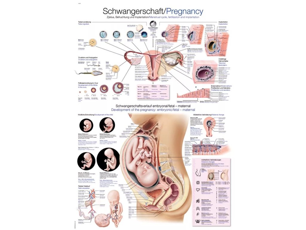 Anatomický plagát „Tehotenstvo“ – AL518 od Erler Zimmer vizuálne znázorňuje vývoj plodu a zmeny maternice počas gravidity. Základná učebná pomôcka pre pôrodníctvo, gynekológiu a predpôrodnú prípravu.
