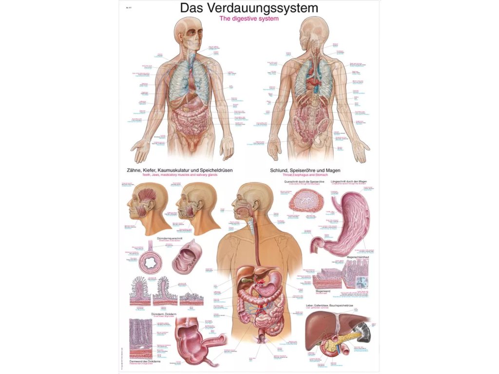 Anatomický plagát „Tráviaci systém“ – AL517 od Erler Zimmer je vzdelávacia pomôcka, navrhnutá pre výučbu anatómie tráviaceho traktu. Tabuľa je veľkosti 50 × 70 cm a predstavuje presné farebné ilustrácie s označením jednotlivých častí, ako sú ústna dutina, pažerák, žalúdok, tenké a hrubé črevo, pečeň, žlčník, pankreas, konečník a ďalšie štruktúry.