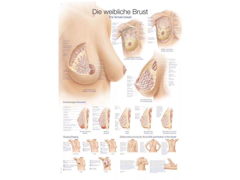 Anatomický plagát „Ženské prsné žľazy“ – AL534 od Erler Zimmer je vysoko kvalitná vzdelávacia pomôcka zameraná na komplexnú anatómia ženského prsníka. Tabuľa je vyrobená z odolného 200g/m² umeleckého papiera a dodáva sa s pripojiteľnými plastovými lištami pre ľahké zavesenie. Grafika prehľadne znázorňuje vnútorné štruktúry prsníka, ako sú mliečne žľazy (glandulae mammariae), mliekovody (ductus lactiferi), tukové a spojivové tkanivá a lymfatické cievy a uzliny (dôležité pre diagnostiku ochorení). Nomenklatúra je uvedená v nemeckom a anglickom jazyku. Táto anatomická tabuľa je neoceniteľným zdrojom pre gynekológov, pôrodné asistentky, onkologické ambulancie a je vhodná do učební, kliník a ordinácií na účely edukácie pacientok o prevencii, samovyšetrovaní prsníkov a výučby mamológie.
