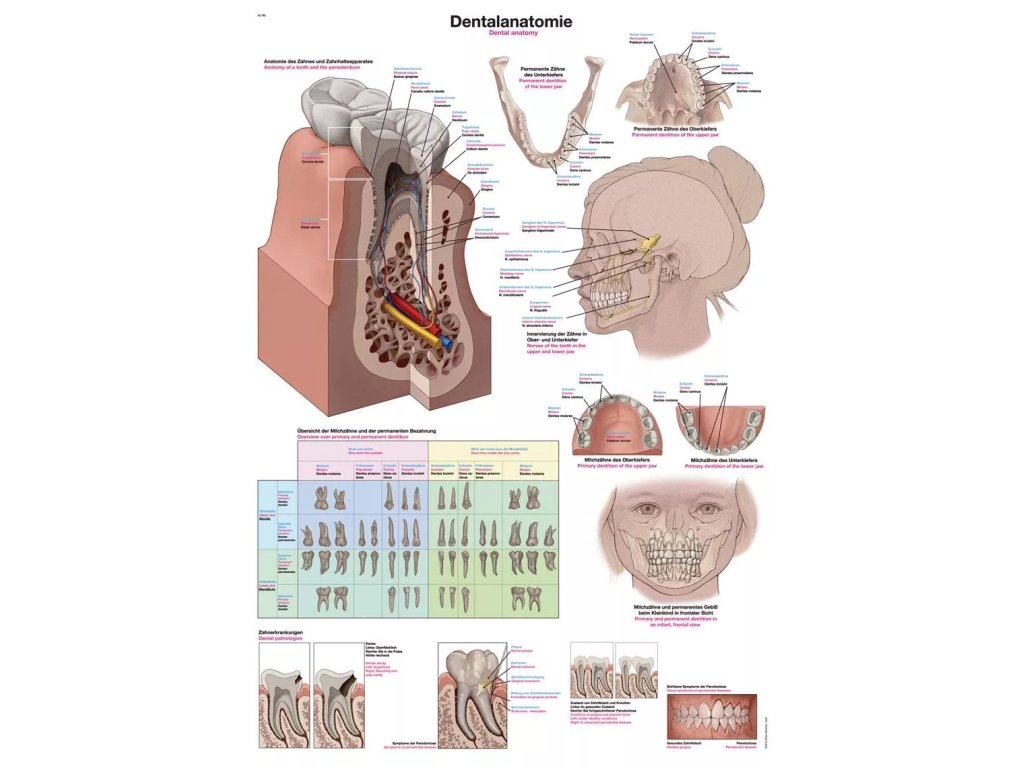 Anatomický plagát „Zubná anatómia“ – AL562 od Erler Zimmer je špecializovaná vzdelávacia pomôcka zameraná na detailnú anatómia zubov a ich okolia. Plagát je vyrobený z vysokokvalitného 200g/m² umeleckého papiera a dodáva sa s pripojiteľnými plastovými lištami pre ľahké zavesenie. Grafika prehľadne znázorňuje typy zubov (rezáky, očné zuby, črenové zuby, stoličky), kompletný prierez zubom s vrstvami ako sklovina, dentín, zubná dreň a cement, ako aj štruktúry parodontu (závesný aparát zuba). Tento plagát je kľúčový pre pochopenie zdravia ústnej dutiny, zubnej kazy a ochorení ďasien. Nomenklatúra je uvedená v nemeckom a anglickom jazyku. Tento anatomický plagát je neoceniteľným zdrojom pre zubných lekárov, zubných technikov, ústnych hygienikov a študentov stomatológie. Je ideálny do zubných ordinácií a učební na účely edukácie pacientov a výučby zubnej morfológie.