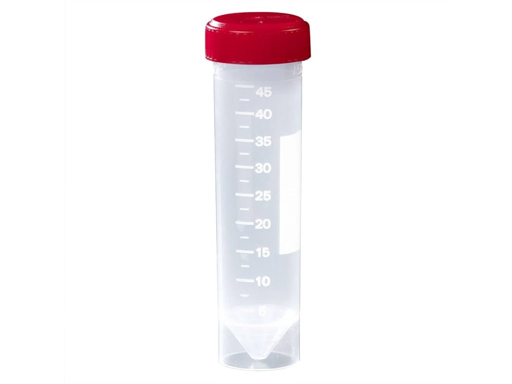 Sterilná centrifugačná skúmavka s objemom 50 ml, rozmermi 30×115 mm, so samostatne stojacou základňou a červeným skrutkovacím uzáverom. Jednotlivo balená, cena uvedená za 1 kus I FL Medical.