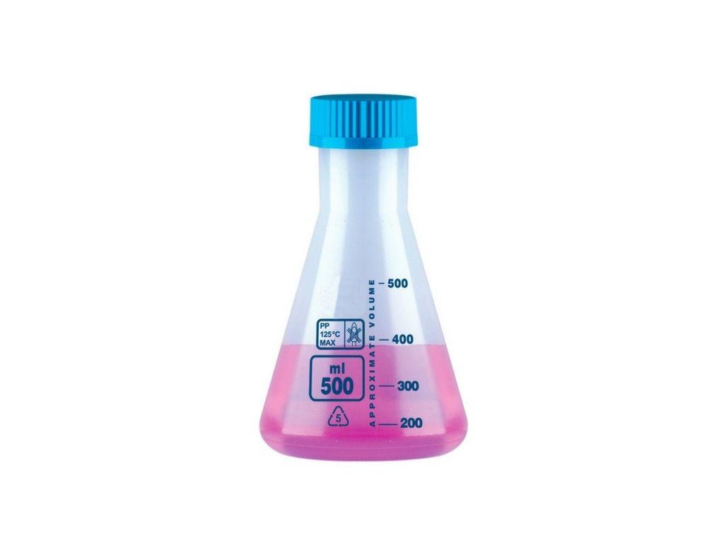 Erlenmeyerova banka z PP plastu, so skrutkovacím uzáverom, graduovaná, autoklávovateľná a vhodná pre potravinárske aj laboratórne použitie – Lamaplast.