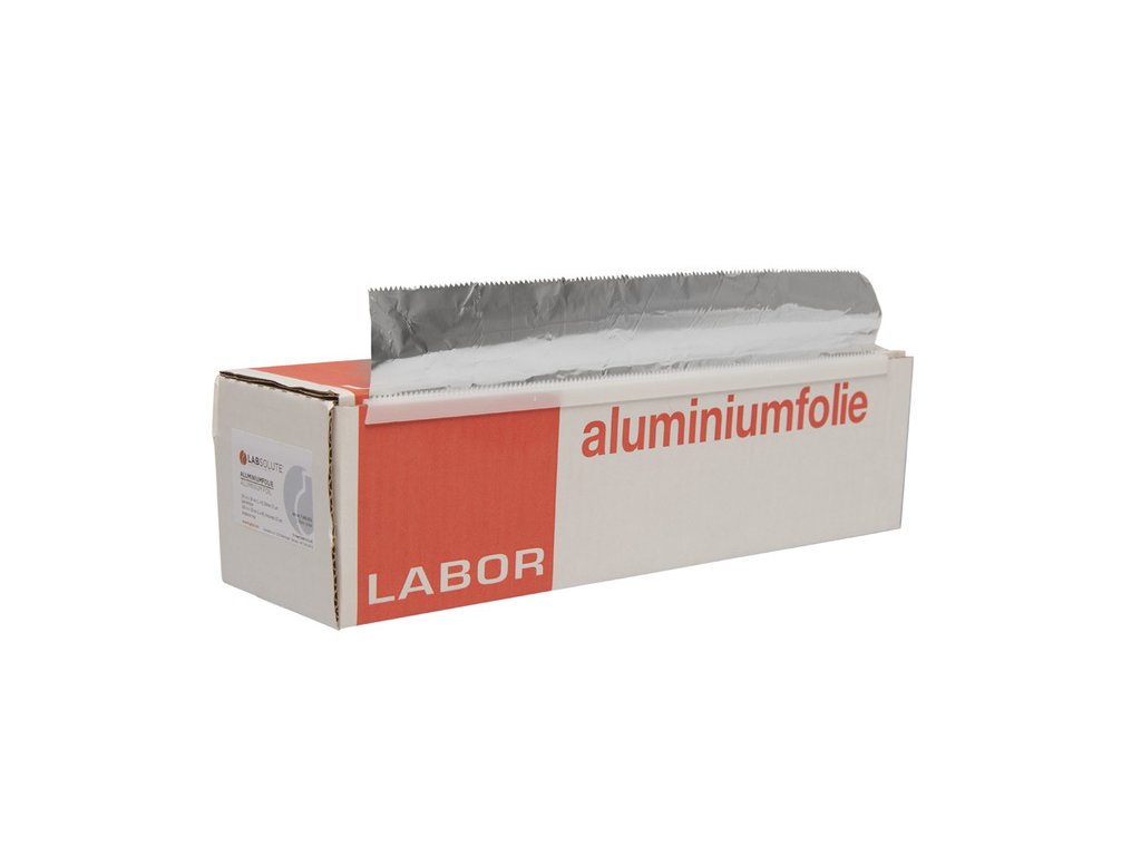 Hliníková fólia 100 m x 50 cm; hrúbka 30µm; LABSOLUTE® – fólia vo veľkej rolke s dávkovacím boxom. Odolná voči vlhkosti, tukom aj teplu. Vhodná na priamy kontakt s potravinami. Výrobca: LABSOLUTE®.
