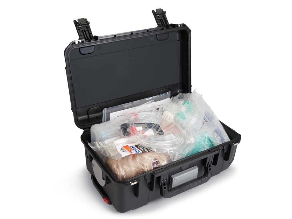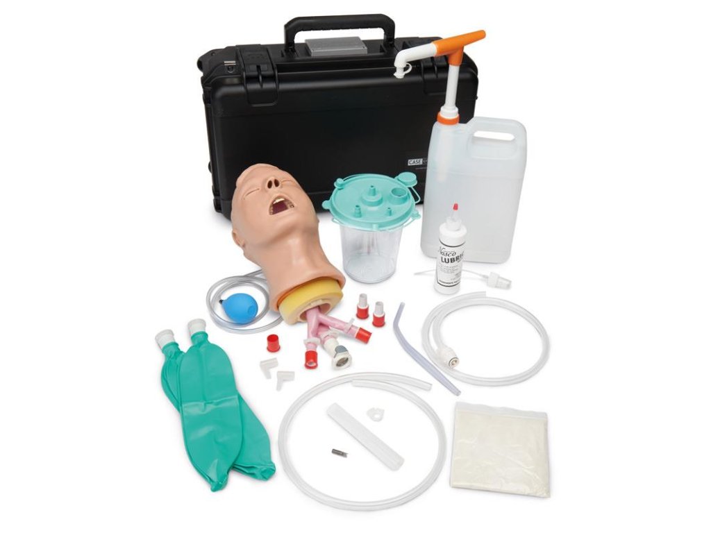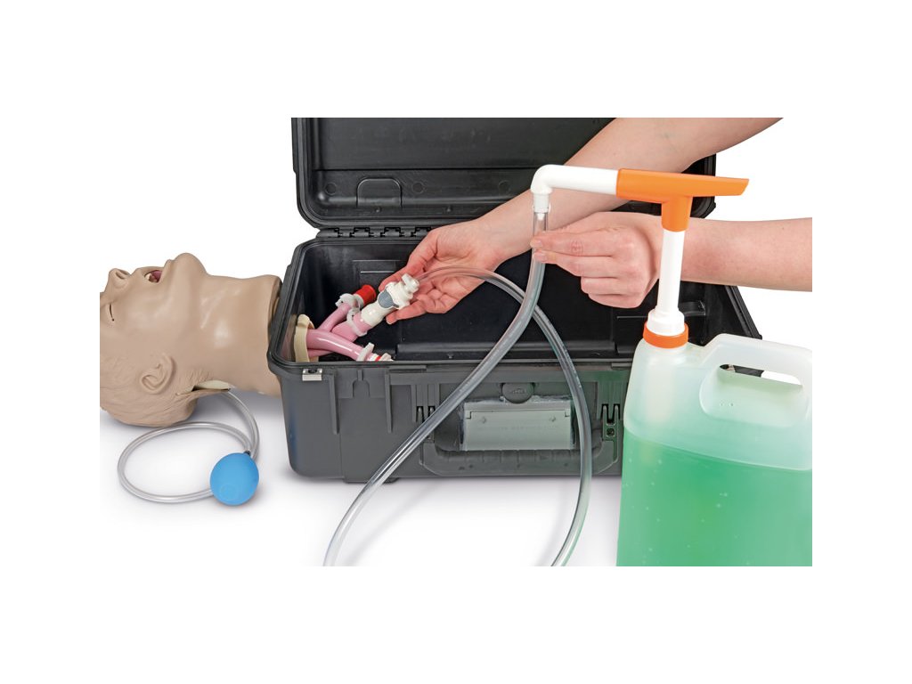 Set obsahuje všetky potrebné komponenty: hlava pre airway management, odsávací kanister, hadice, pumpa, simulované pľúca bez latexu, príslušenstvo na upevnenie a údržbu modelu, mazadlo, prepravný kufor.
