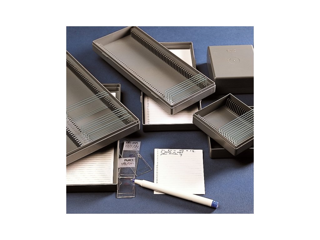 Krabička na mikroskopické sklíčka KartellLabware – 50 miest umožňuje prehľadné uskladnenie až 50 mikroskopických sklíčok 76 × 26 mm. Každý slot je číslovaný a zodpovedá indexovej karte pre ľahké vyhľadávanie. Odnímateľné veko zabezpečuje pohodlný prístup.