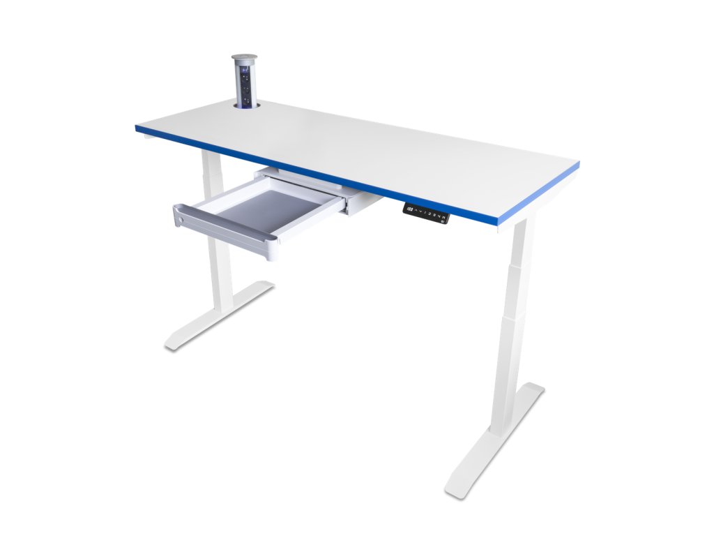 Laboratórny stôl LT-150 s nastaviteľnou výškou a chemicky odolnou HPL pracovnou doskou (1500 × 600 mm). Stabilný, hygienický a ergonomický stôl s voliteľnou zásuvkou a blokom elektrických zásuviek.
