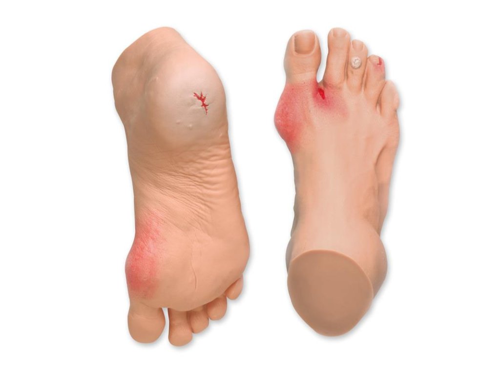 Realistický replika chodidla natiahnutá do životnej veľkosti, zobrazujúca hallux valgus (vbočený palec), ktoré-vrypy, kurí oko, zápal nechtu, otvorené rany, suchá a popraskaná pokožka.
