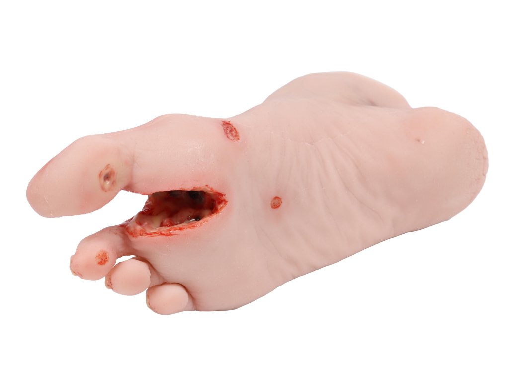Životná veľkosť s hlbokým vredom a nekrotickým tkanivom po resekcii prsta, s viacerými vredmi, léziami a prasknutou pokožkou – ideálny na výučbu starostlivosti o rany u diabetikov.