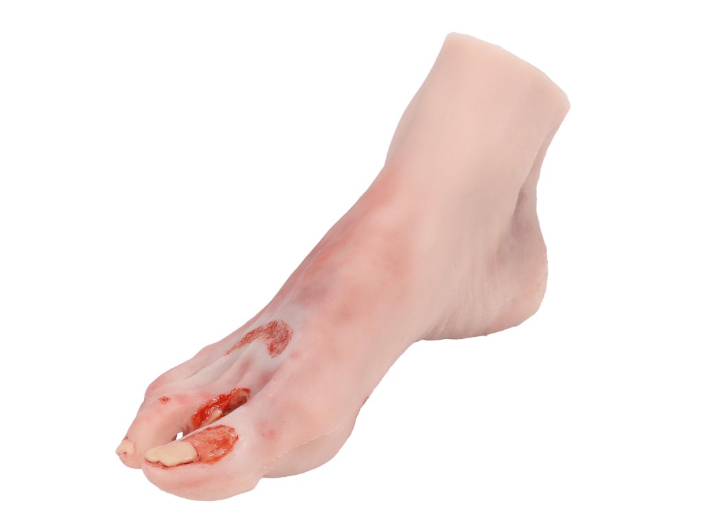 Model Wound Foot s ťažkým štádiom diabetického syndrómu nohy PW007 od ERLER ZIMMER poskytuje realistickú pomôcku pre výučbu ošetrovania diabetickej nohy. Chodidlo má po ray resekcii dôsledok nekrózy a hlbokého vredu. Okrem toho sú zobrazené viaceré ulcerácie, lézie a praskliny pokožky, ktoré sú typickými komplikáciami u pacientov s diabetom.