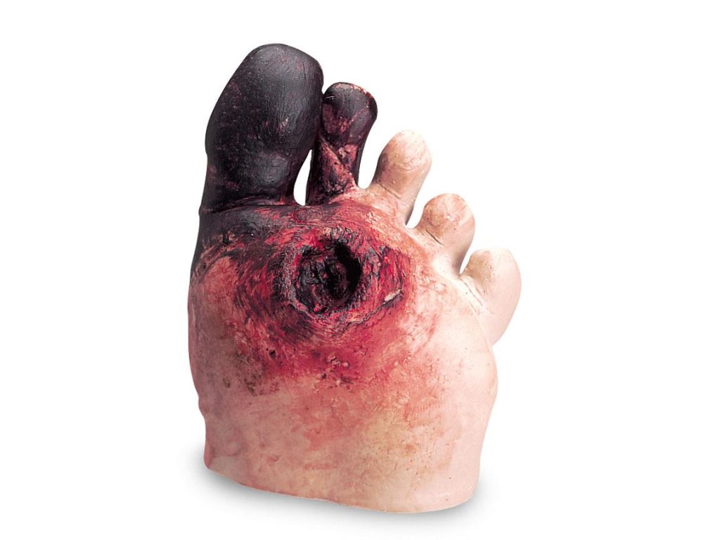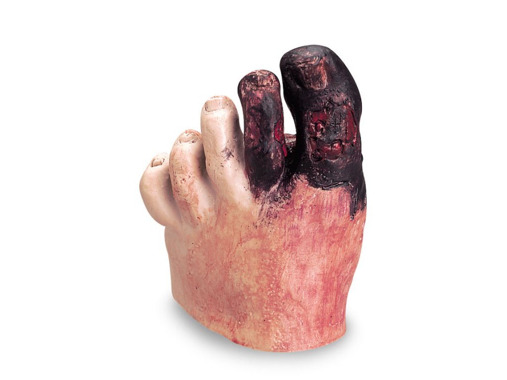 Model Unhealthy Foot R10027 od ERLER ZIMMER slúži na výučbu starostlivosti o nohy u diabetikov a zdôrazňuje význam dôkladnej hygieny, výživy a prevencie komplikácií. Tento model znázorňuje: