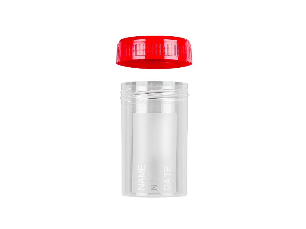 Odberová nádoba na moč 60 ml od FL Medical s červeným polyetylénovým vrchnákom baleným oddelene (screw cap apart) a matnou popisnou plôškou. Vyrobená v cleanroom ISO 8. Balenie: bulk (ks).