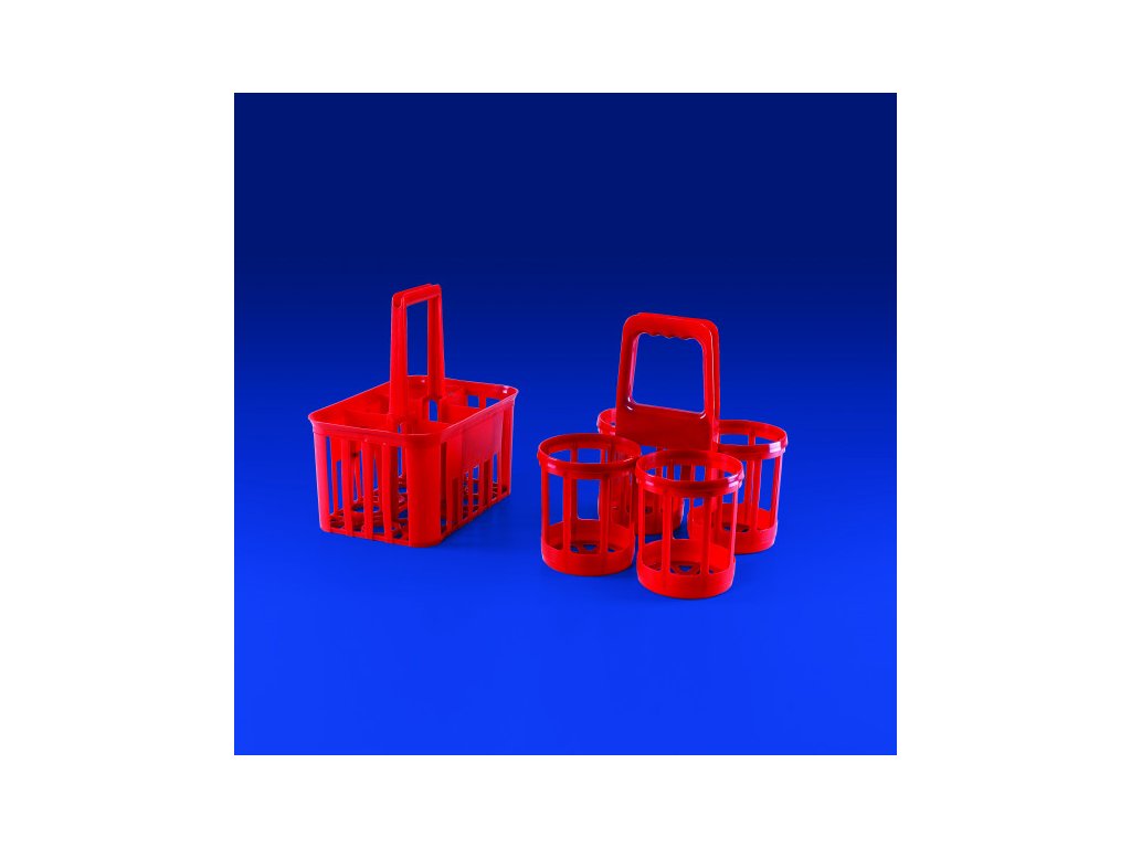 Nosič z polypropylénu na 6 fliaš do priemeru 90 mm. Ergonomický, stohovateľný, ideálny do laboratórií – Karell Labware Art. 395.