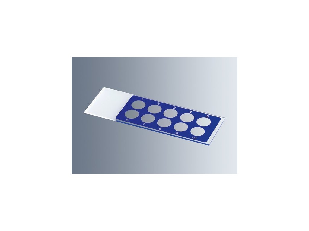 Podložné sklíčko s epoxidovou maskou, 10 jamek, priemer 6 mm, modré číslovanie, (4 bal. x 50 ks), MARIENFELD – kvalitné podložné sklíčko na mikroskopické pozorovanie. Výrobca: Marienfeld