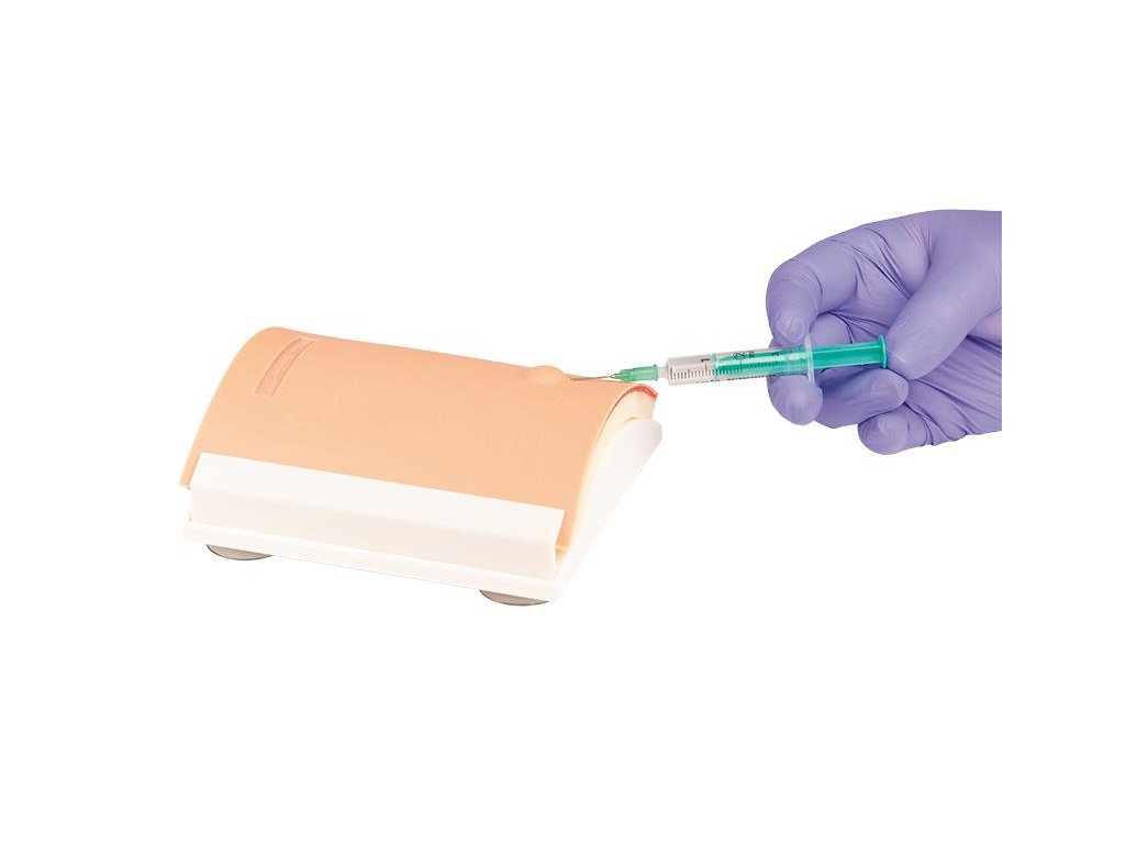 Simulátor intradermálnych injekcií číslo 7110 od ERLER ZIMMER je určený na precvičovanie techniky intradermálnej aplikácie liekov. Je vybavený flexibilnou, realistickou „kožou“ napnutou na oblom podstavci, ktorá imituje vzhľad a pružnosť pokožky. Model obsahuje 6 miest na vpichy, kde — ak je tekutina injikovaná správne — vznikne charakteristický kožný pľuzgier („wheal“). Po tréningu sa kvapalina dá nasávať späť do striekačky, čím sa miesto obnoví na ďalšie použitie.