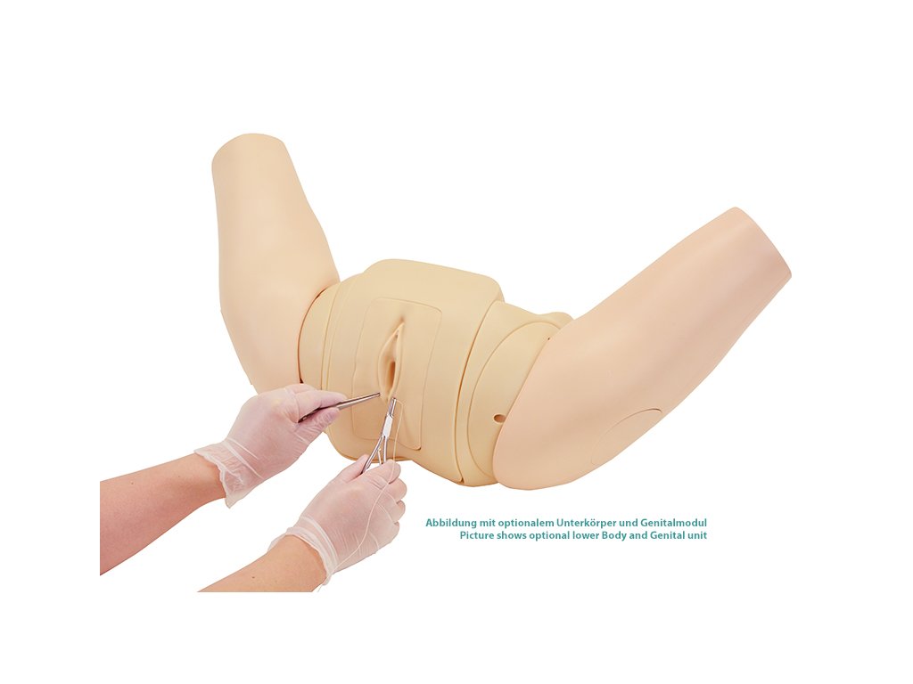 Simulátor perineálneho ošetrenia Perineal Repair Simulator R16180 od ERLER ZIMMER je výučbová pomôcka na precvičenie techniky šitia pri pôrodnej trhline prvého stupňa hrádze. Koža simulátora je mäkká, pružná, no zároveň pevná a trvácna, čo umožňuje viacnásobné použitie.