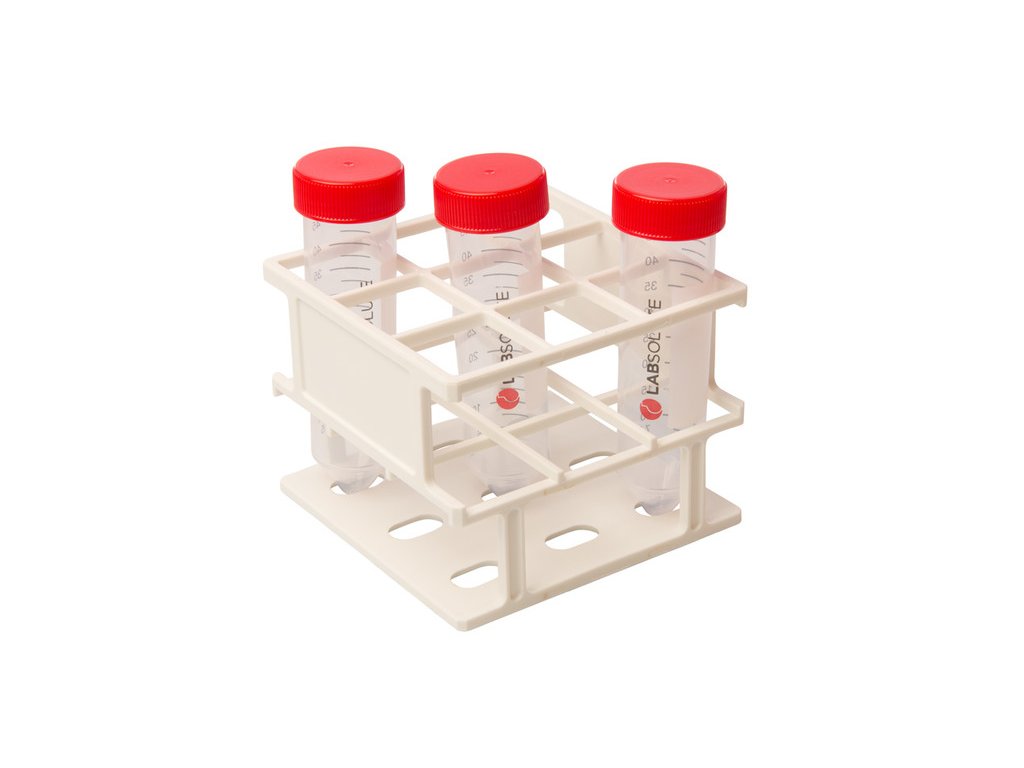 Robustný stojan LABSOLUTE z vystuženého nylónu (PA) pre 50 ml centrifugačné skúmavky. Autoklávovateľný, vhodný do vodného kúpeľa, s plochou na označenie. Formát 3x3