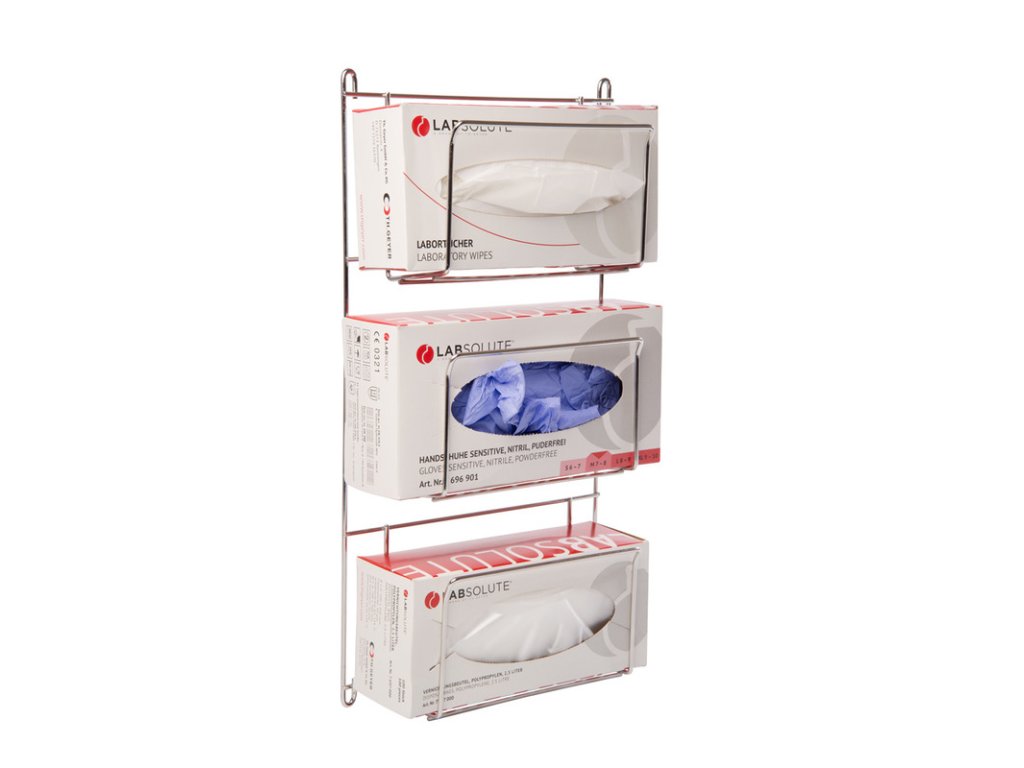 Držiak na 3 boxy rukavíc z nehrdzavejúcej ocele – ideálny pre väčšie laboratóriá, kde je potrebná viacnásobná distribúcia rukavíc alebo utierok. Výrobca: LABSOLUTE®.