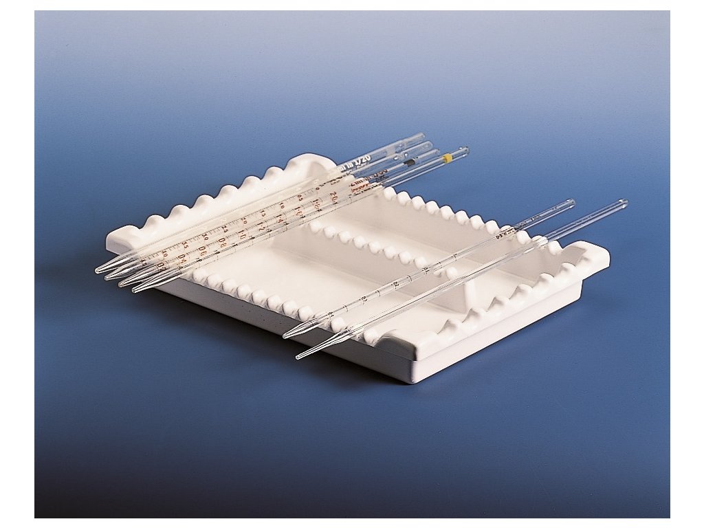Tácka na pipety do zásuvky s viacúčelovým profilovaným povrchom umožňuje uložiť 7 pipiet s priemerom do 20 mm v pozdĺžnej polohe alebo 16 pipiet do 10 mm priečne. Vyrobená z chemicky odolného PVC, vhodná nielen pre pipety, ale aj iné laboratórne pomôcky. Vďaka rozmerom 216×283 mm a výške 40 mm sa bez problémov zmestí do štandardných zásuviek v laboratóriách. Skvelé riešenie pre ergonomickú organizáciu a ochranu sklenených nástrojov. Dodáva výrobca KartellLABWARE.