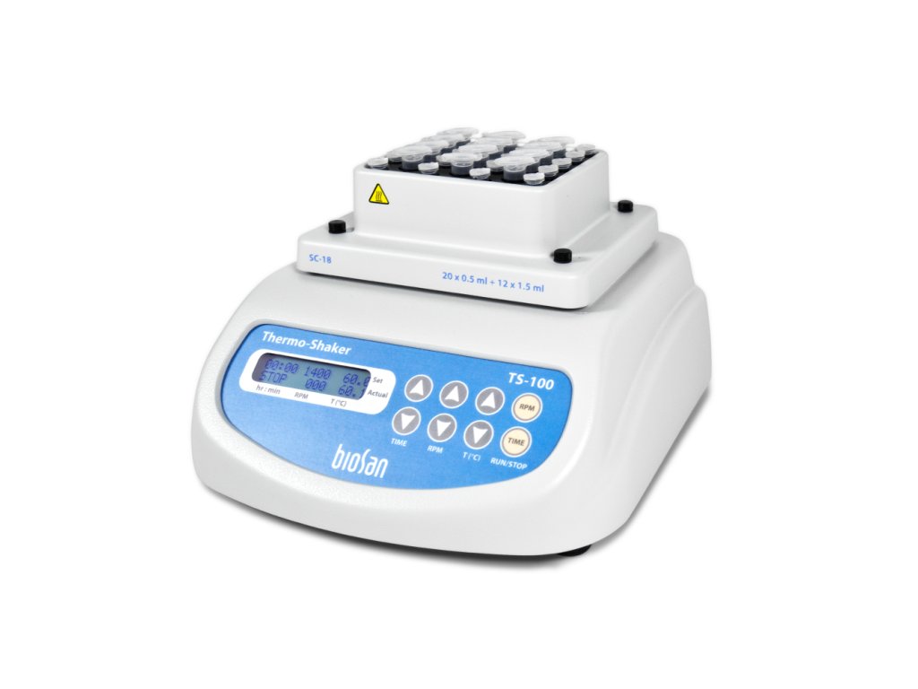 Termo-trepačka TS-100 kombinuje trepanie a termostatovanie vzoriek v mikroskúmavkách alebo PCR platniach s presnou reguláciou teploty do 100 °C a nastaviteľnou rýchlosťou.